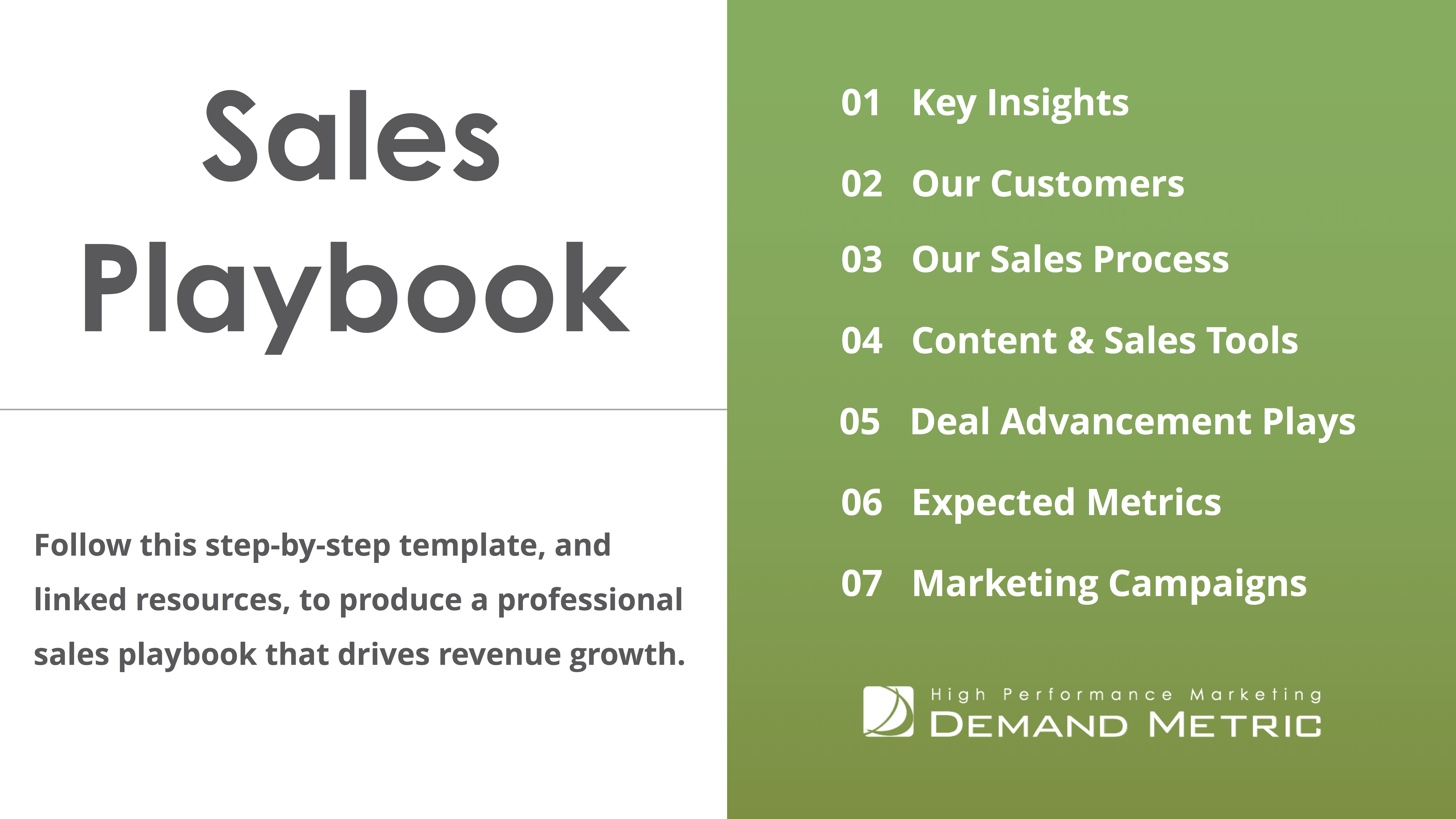 If you don’t have a sales playbook, use the Demand Metric Sales Playbook Template to put one in place. If you do have a sales playbook, use this resource to compare how complete it is and get ideas for improving it. The Demand Metric Sales Playbook Template contains links to a number of other tools and templates that will make creating your playbook easier to do. We welcome your feedback on this resource, and encourage you to contact us if you have any questions about using it.