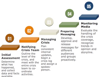 If the crisis is critical, these five steps can occur within just a few hours, and may need to be repeated as the crisis unfolds. Each step must be prepared as much as possible in advance, similar to a fire drill for evacuating during an emergency, so when a public relations crisis does indeed happen, the entire company is on the same page on how to respond accordingly.